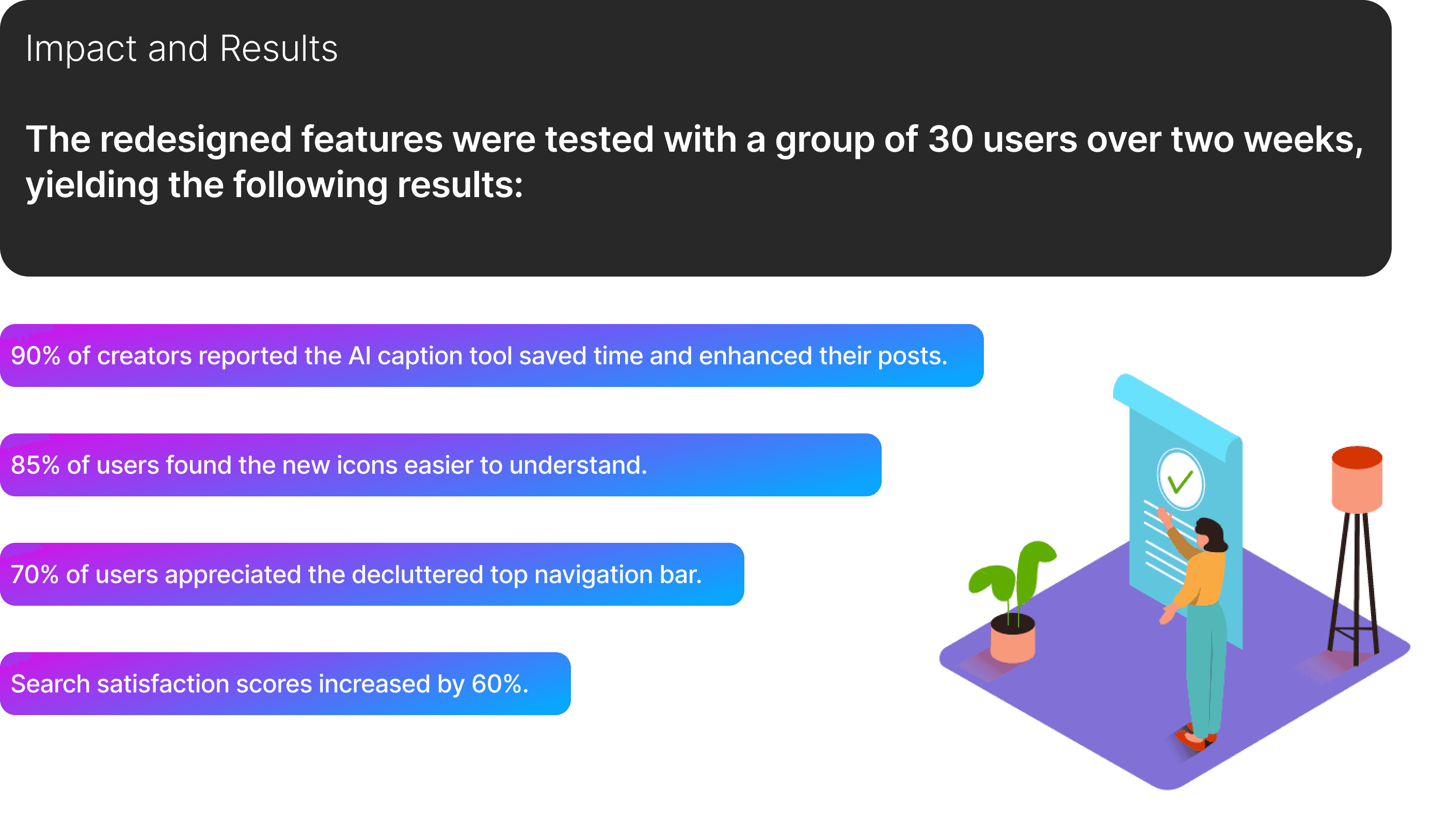 Plus, creators needed more tools to streamline their content creation process, such as captions. My goal was to address these pain points while maintaining the platform's sleek aesthetic and functionality.